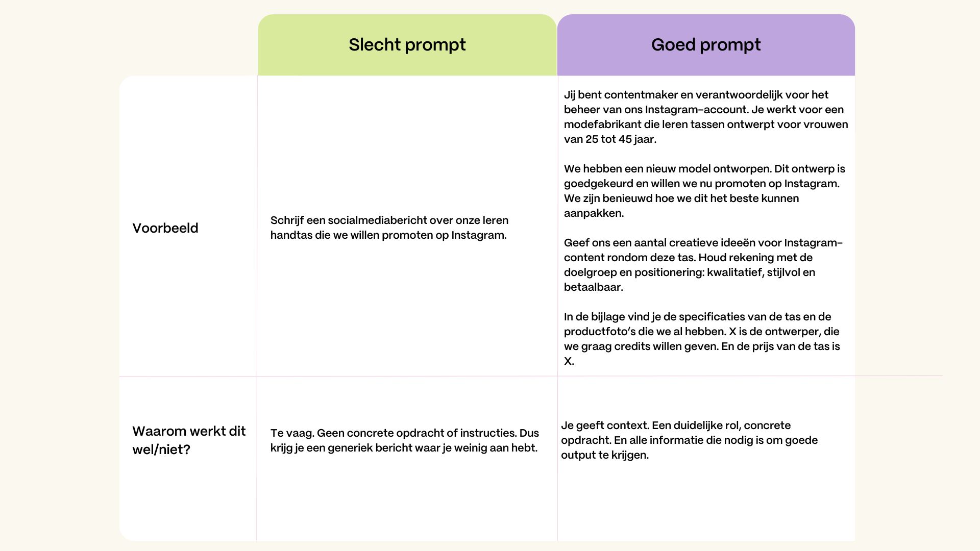 ChatGPT werkt het beste als je duidelijk bent. Hoe meer context je geeft, hoe beter de output. Zie het als een collega die je goed moet briefen. Een vage prompt (de vraag of opdracht aan ChatGPT) levert een vaag resultaat op. Een goede prompt bevat: